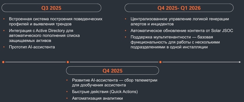 Выпуск версии 2025.2 является частью последовательной стратегии «Солара» по созданию единой платформы мониторинга, обработки и реагирования на инциденты. Такой подход, объединяющий функционал SIEM и SOAR, позволяет компаниям закрывать весь жизненный цикл инцидента в одном окне и сэкономить на внедрении двух технологий до 40%. В планах на начало 2026 года — внедрение поддержки мультитенантности, механизма автоматического обновления контента от экспертов Solar JSOC и дальнейшее развитие AI-агента до уровня senior, способного анализировать большой поток информации и закрывать рутинные задачи.