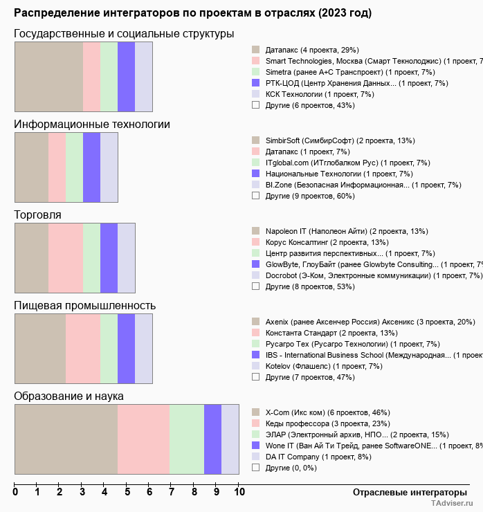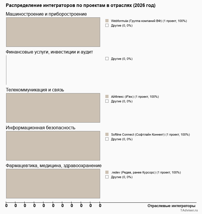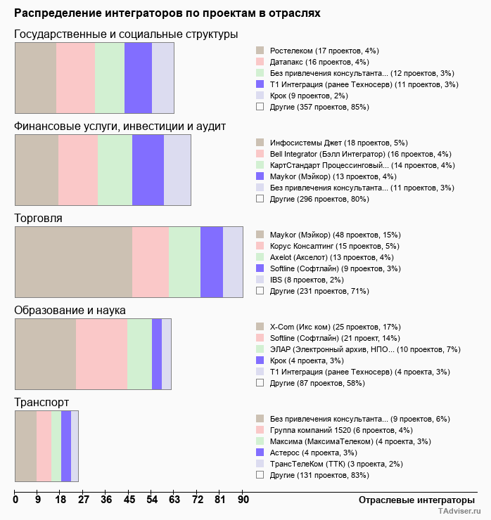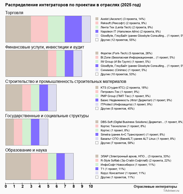 По состоянию на конец марта 2025 года база TAdviser содержит информацию о 2,7 тыс. проектов в сфере ИТ-аутсорсинга. Бо́льшая их часть приходится на три отрасли: государственный сектор, сферы финансовых услуг и торговли.