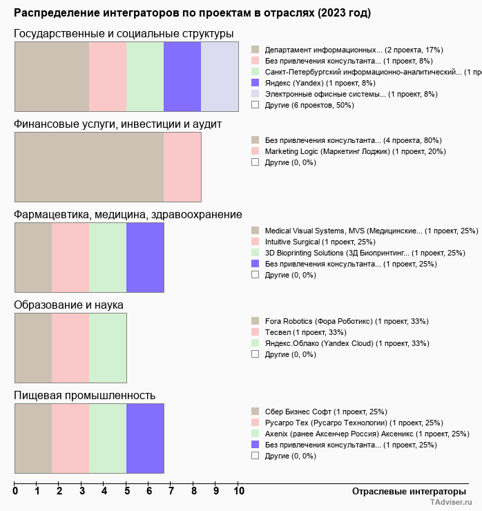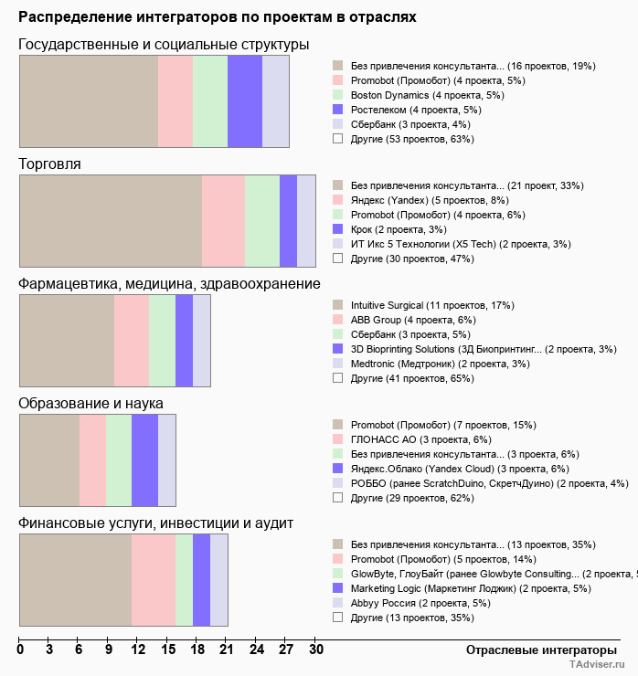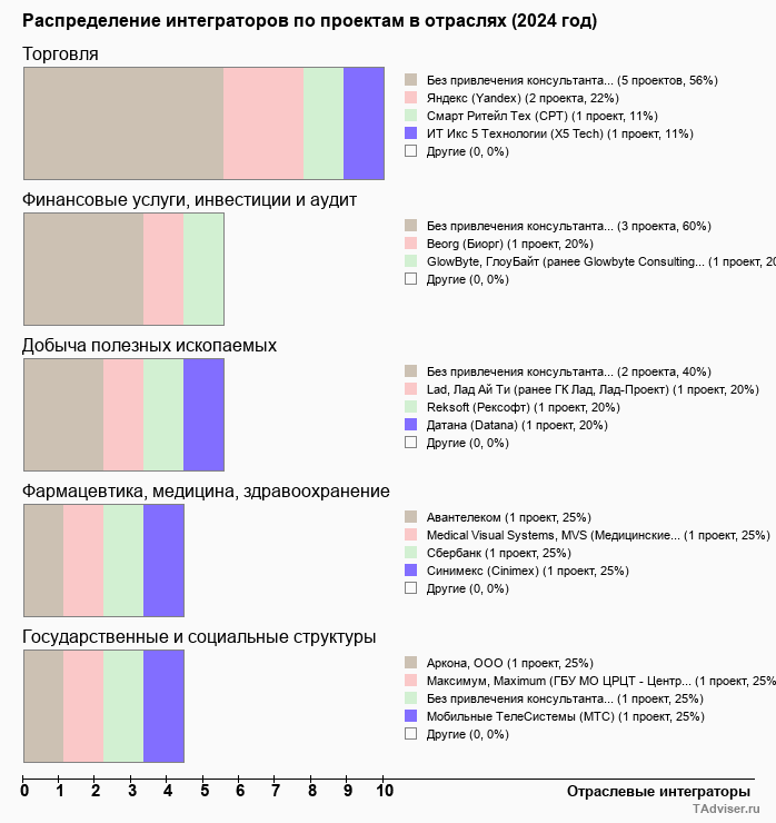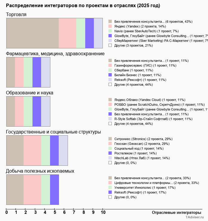 Отраслевое распределение по количеству проектов внедрений