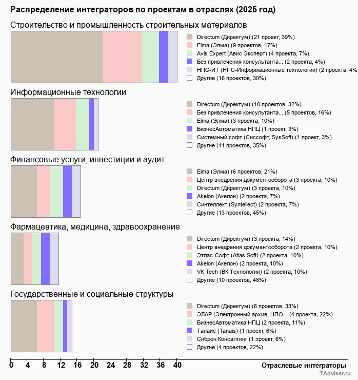За весь период наблюдений база TAdviser аккумулировала информацию о 8,4 тыс. проектов внедрения СЭД/ECM/CSP-систем (по состоянию на декабрь 2024 года). Из них более 1,3 тыс. проектов было выполнено за последние 3 года. В топ-5 отраслей - лидеров внедрений СЭД в 2022-2024 годах входят отрасли строительства, ИТ, финансов, а также государственный сектор и сфера образования.