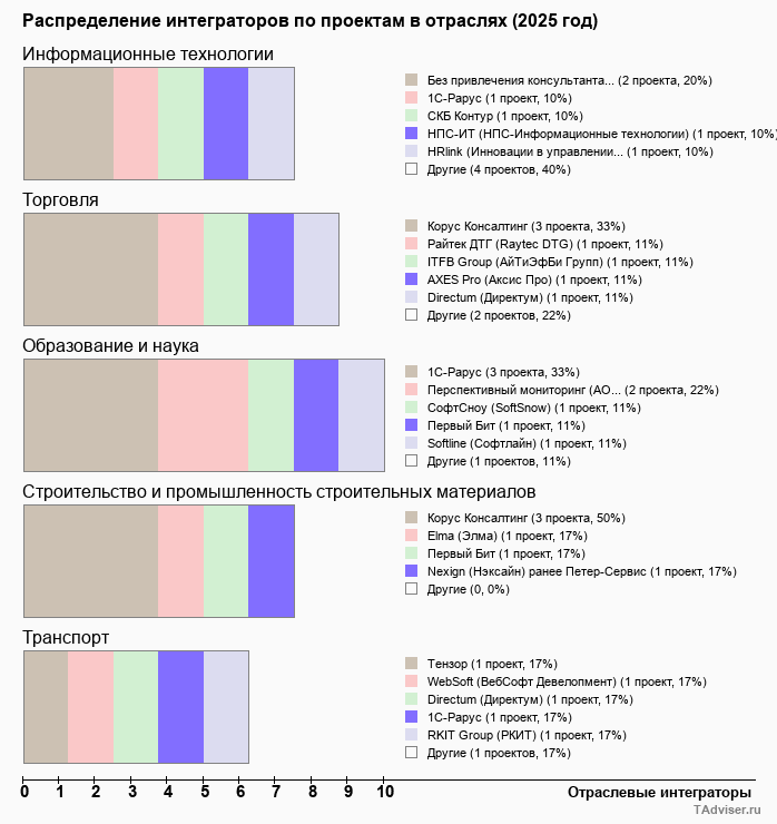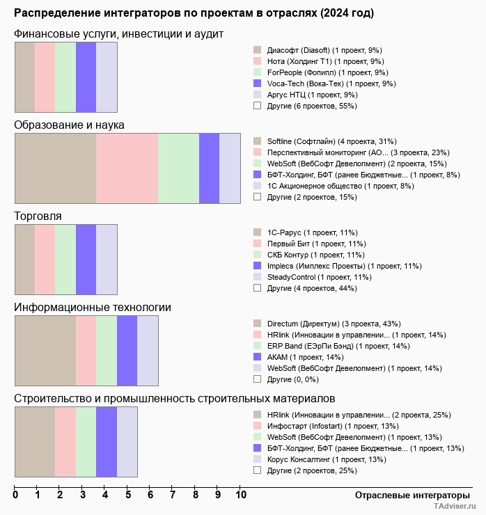 В базе проектов TAdviser содержится информация о более 800 проектов внедрения HR-систем, реализованных за период с 2023 по 2025 год. Чаще всего такие решения внедрялись в 6 отраслях - строительство, ИТ, сфера финансовых услуг, торговля, госсектор и образование.