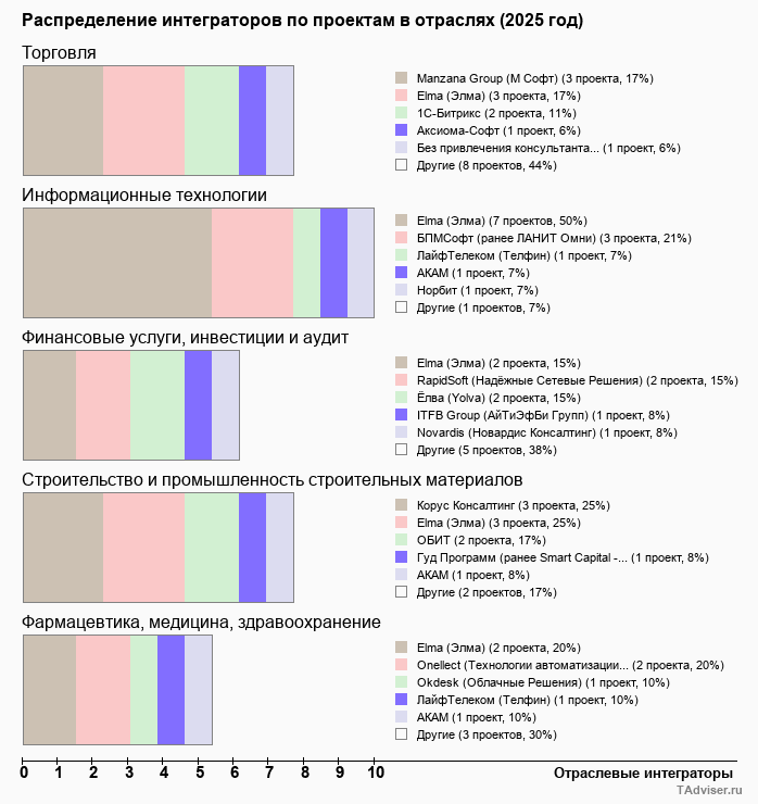 Согласно информации о проектах, содержащейся в базе TAdviser, за 2023-2025 гг. CRM-системы чаще всего внедрялись в торговле, в сфере финансовых услуг, в строительстве, ИТ и здравоохранении. На долю этих отраслей приходится 51% от всех реализованных проектов, известных TAdviser.